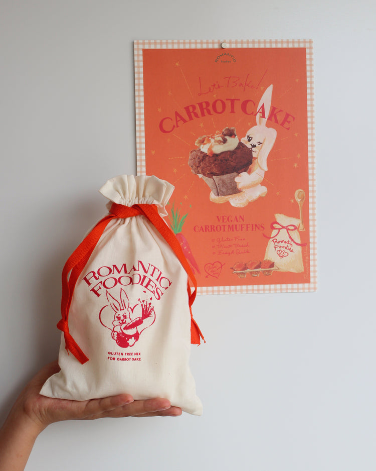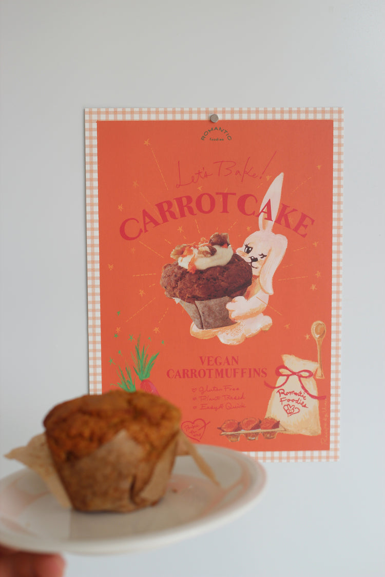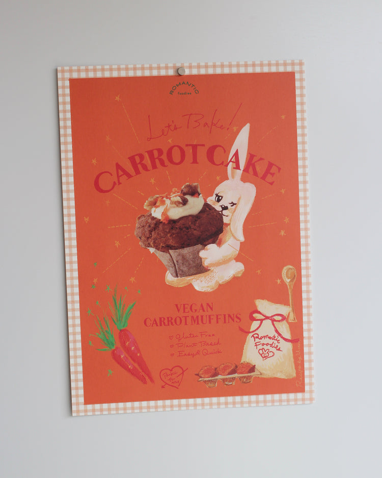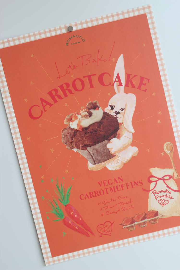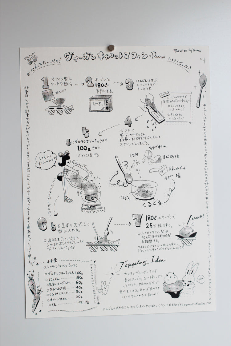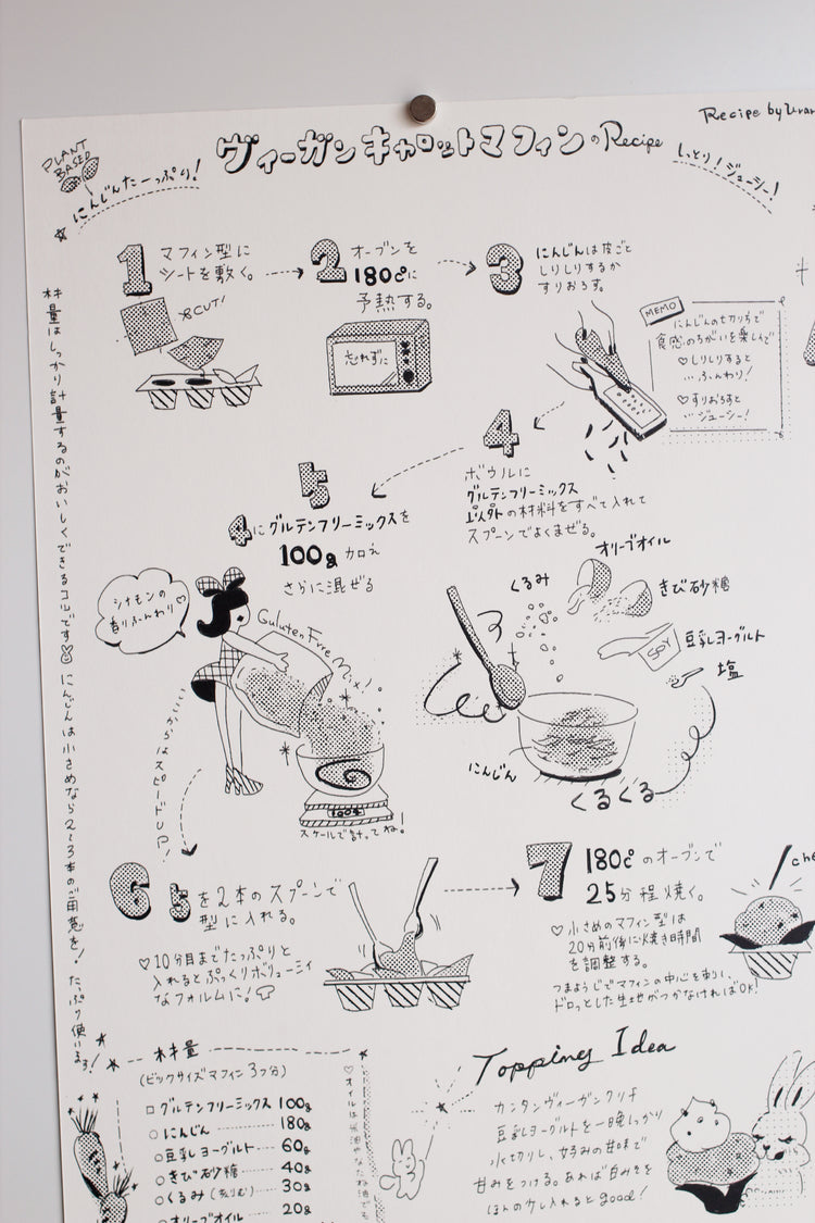 裏面にはヴィーガンキャロットマフィンの手描きレシピつき。サイズはB5サイズ、厚めで風合いのある紙にプリントされたミニポスター。