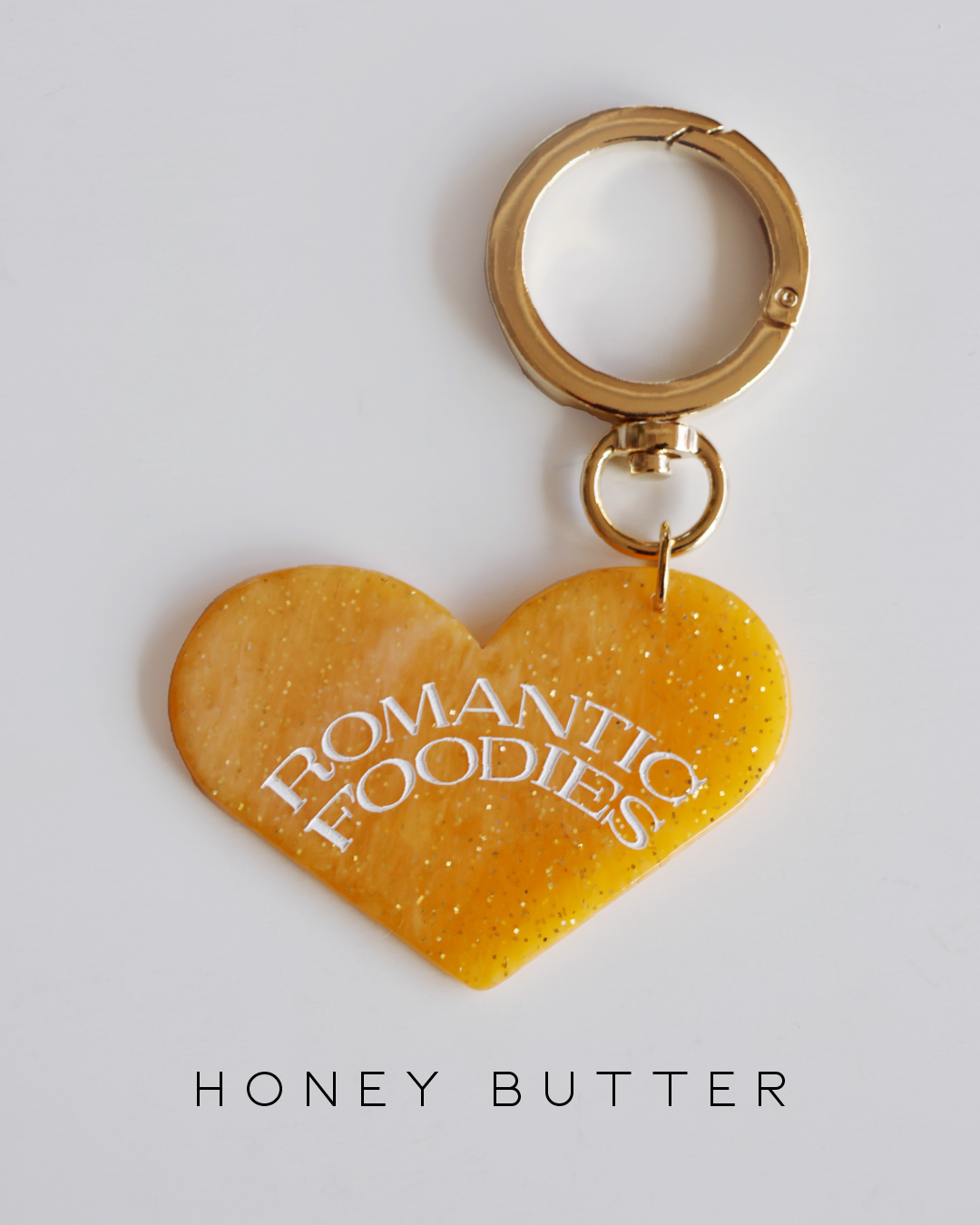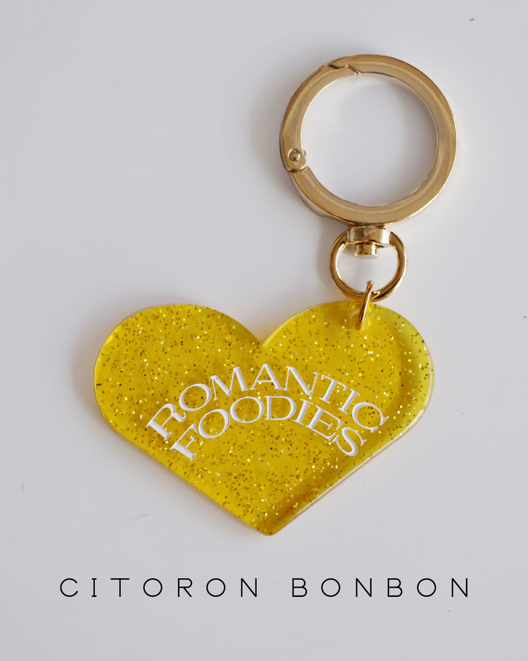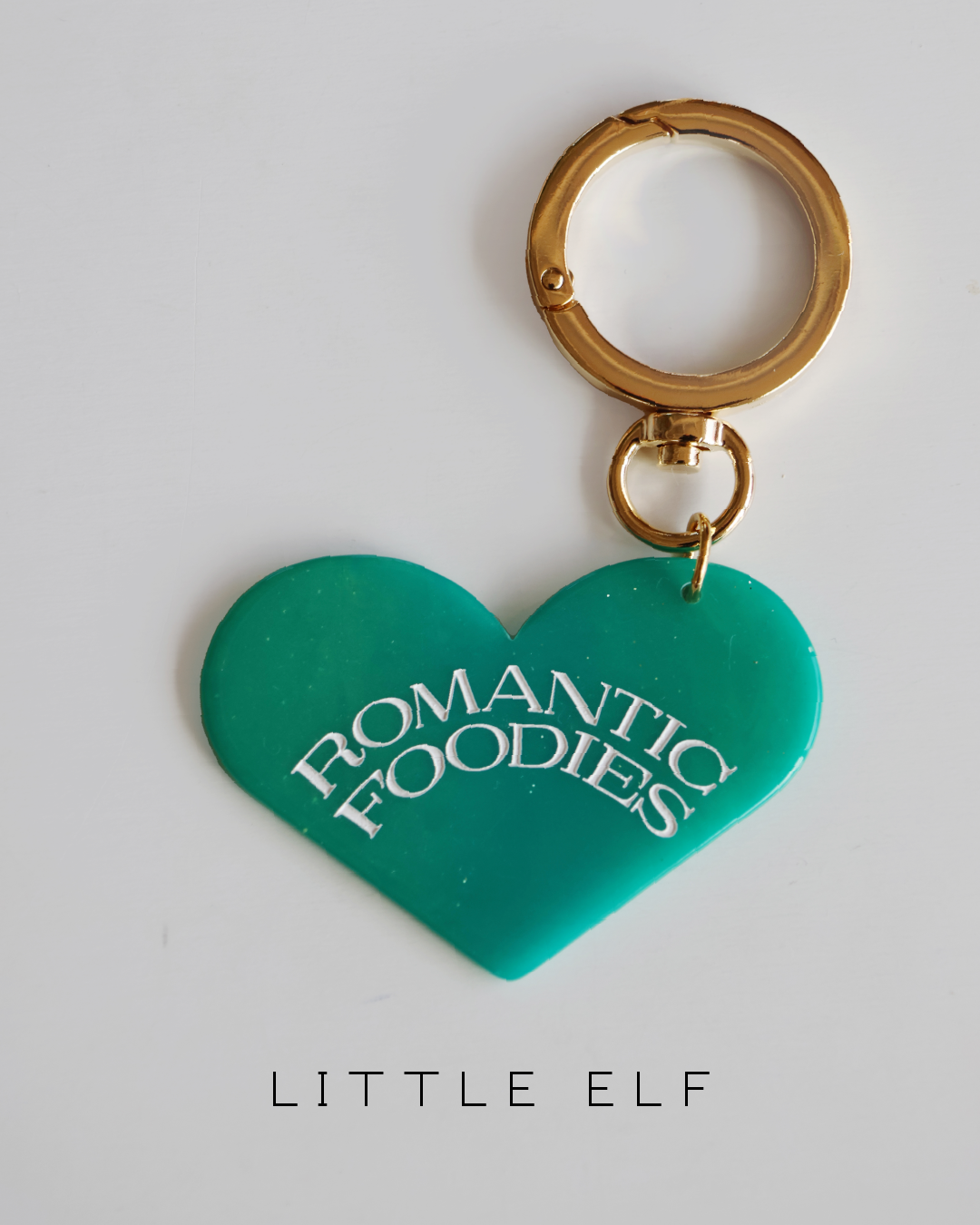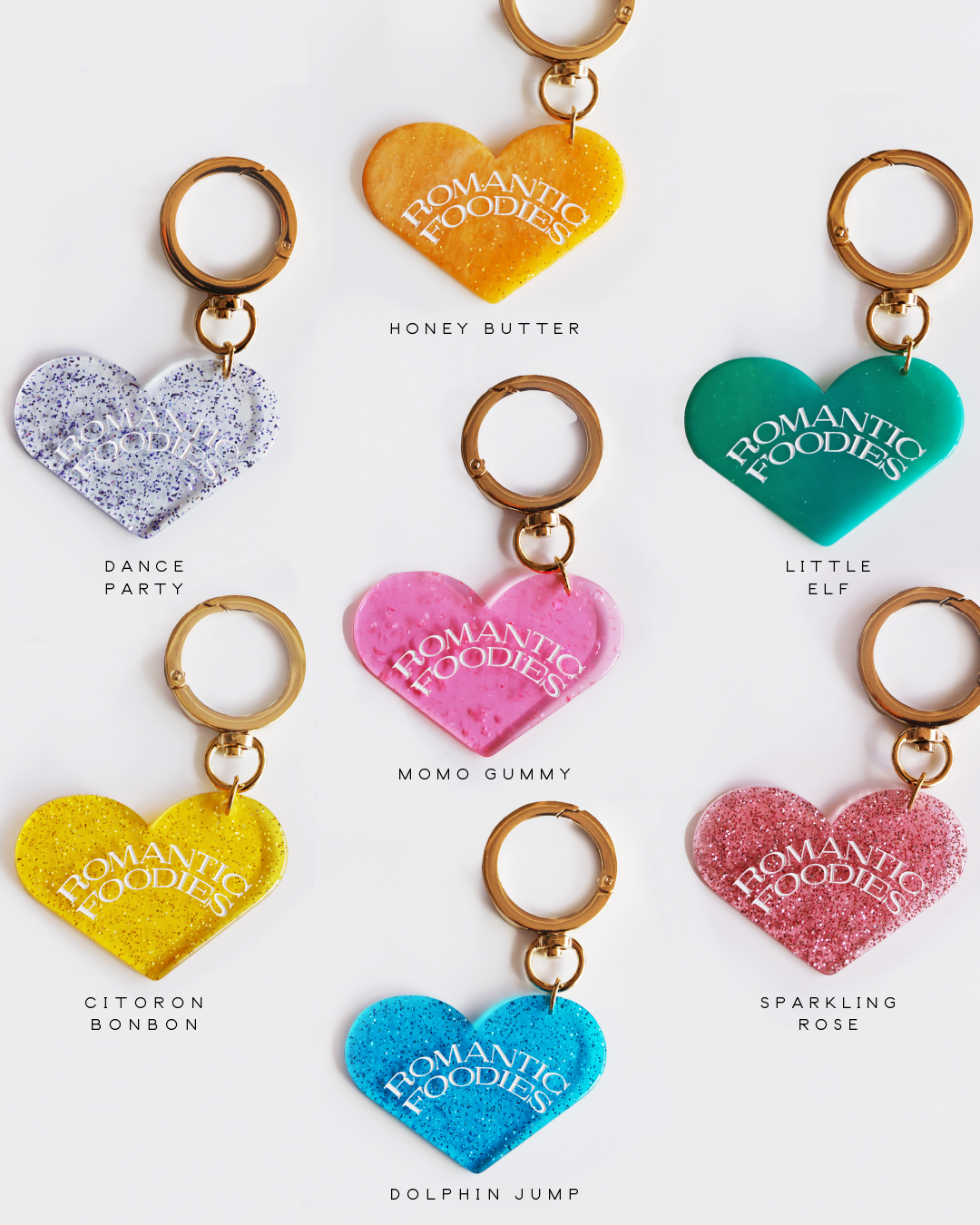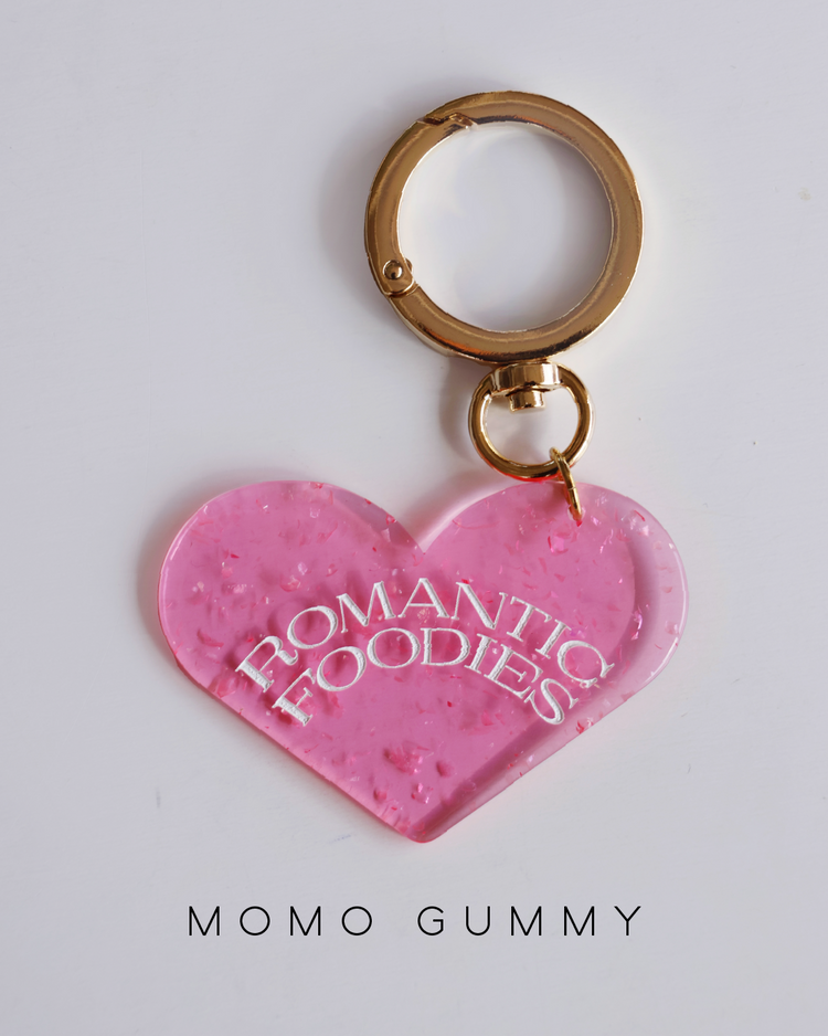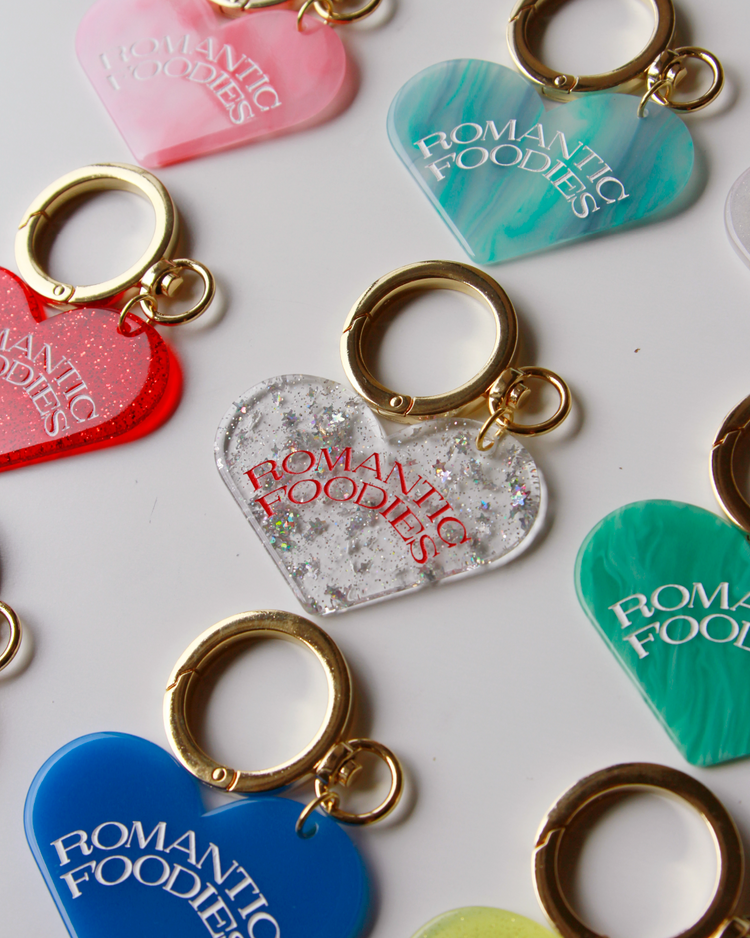 Romantic Foodiesでは資源の循環を行うリユースデザインアイテムを提案します。ハートのチャームは、国内の老舗アクリル工場で、製造過程で廃材になってしまうアクリル板の切れ端を再利用したオリジナルデザイン。