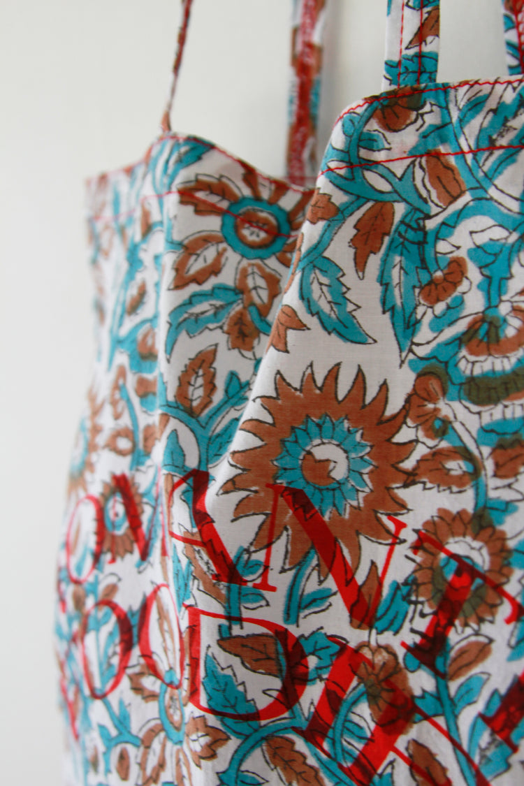 インドにて厳選セレクトした生地は、岡山県の工場にて縫製しています。ロゴは、シルクスクリーンによるハンドプリント。ステッチがポイントの持ち手は、ジーンズのベルトループを縫う専用ミシンで、ひとつひとつ丁寧に縫製しています。さらに、ウォッシュ加工で、ナチュラルな風合いに仕上がります。