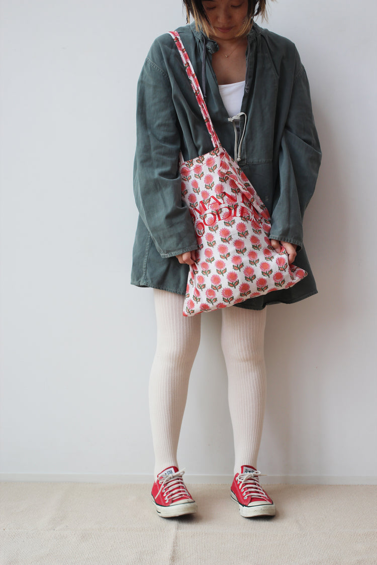 インドにて厳選セレクトした生地は、岡山県の工場にて縫製しています。ロゴは、シルクスクリーンによるハンドプリント。ステッチがポイントの持ち手は、ジーンズのベルトループを縫う専用ミシンで、ひとつひとつ丁寧に縫製しています。さらに、ウォッシュ加工で、ナチュラルな風合いに仕上がります。