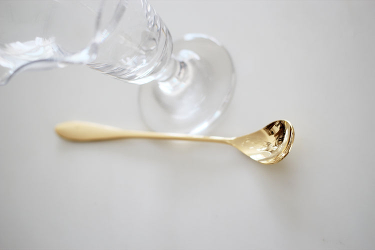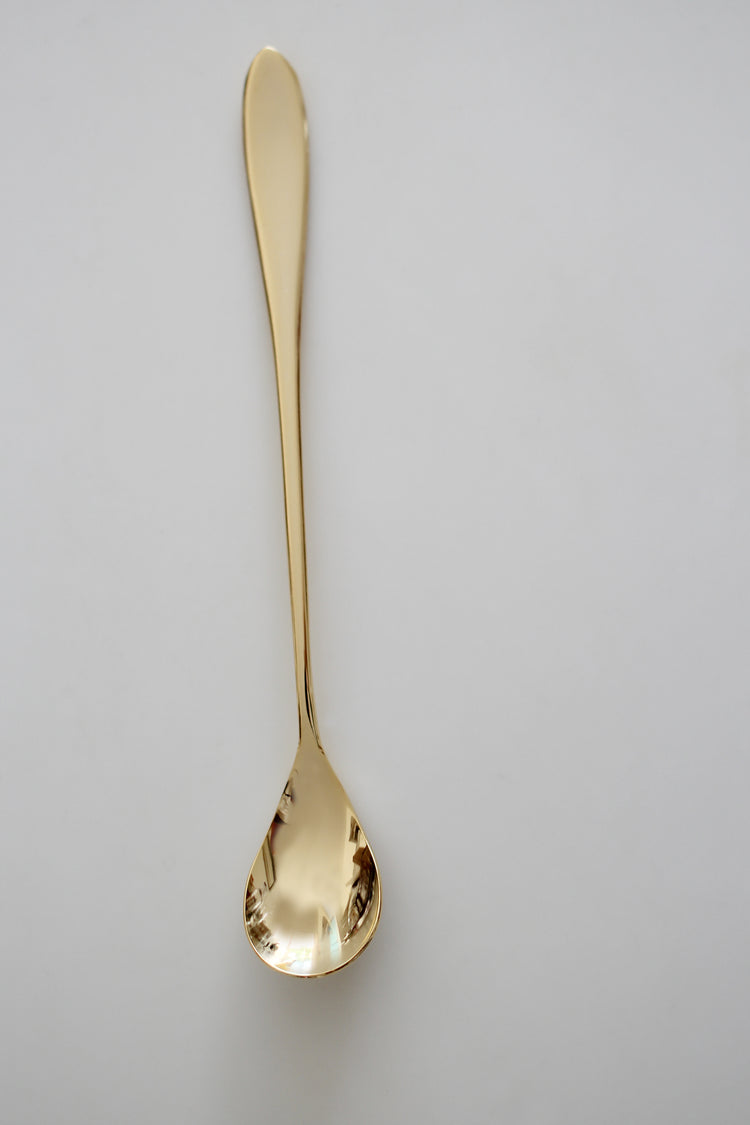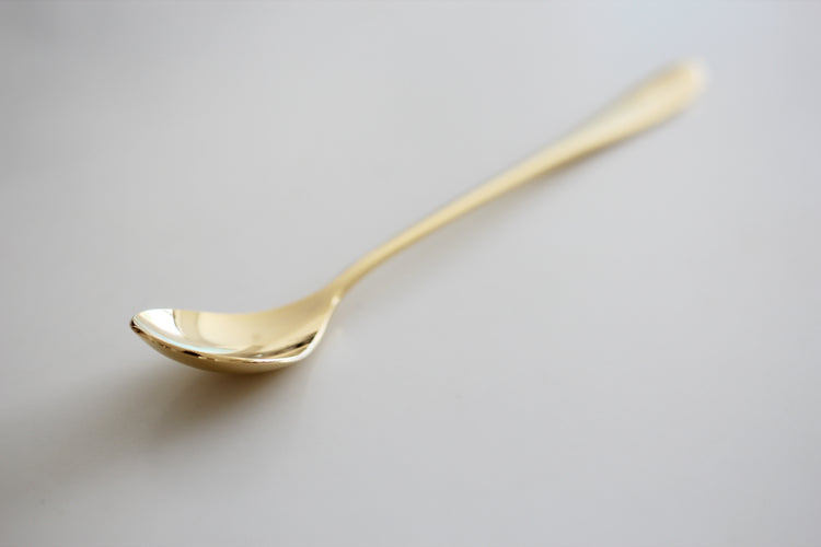 ゴールドのきらめきが可愛いパフェスプーン。メロンソーダなどにもぴったりのロングサイズ。先端はツヤあり加工。食品を艶やかに見せます。持ち手はマット加工が施され、シックで高級感あるたたずまい。国内の工場の独自技術によってゴールド焼き付け加工がされたステンレス素材。