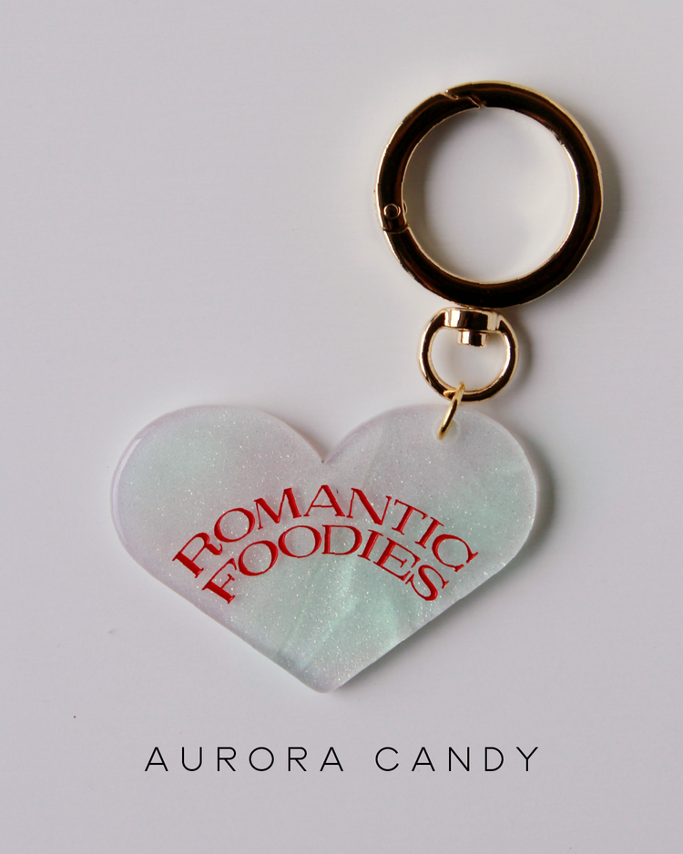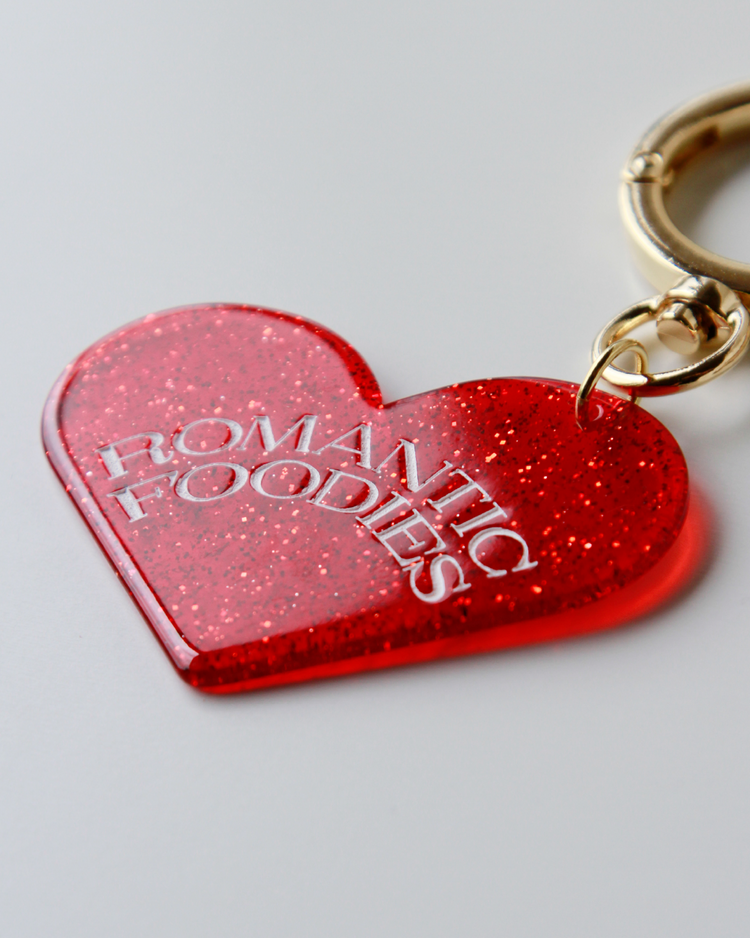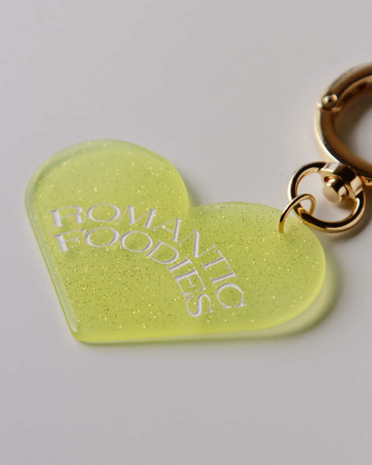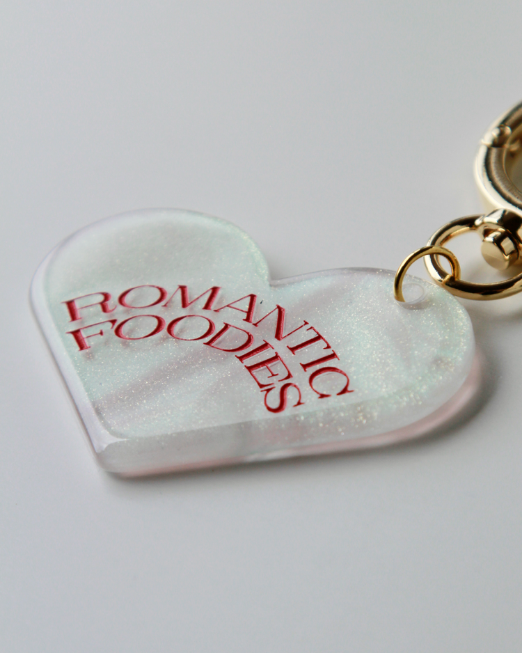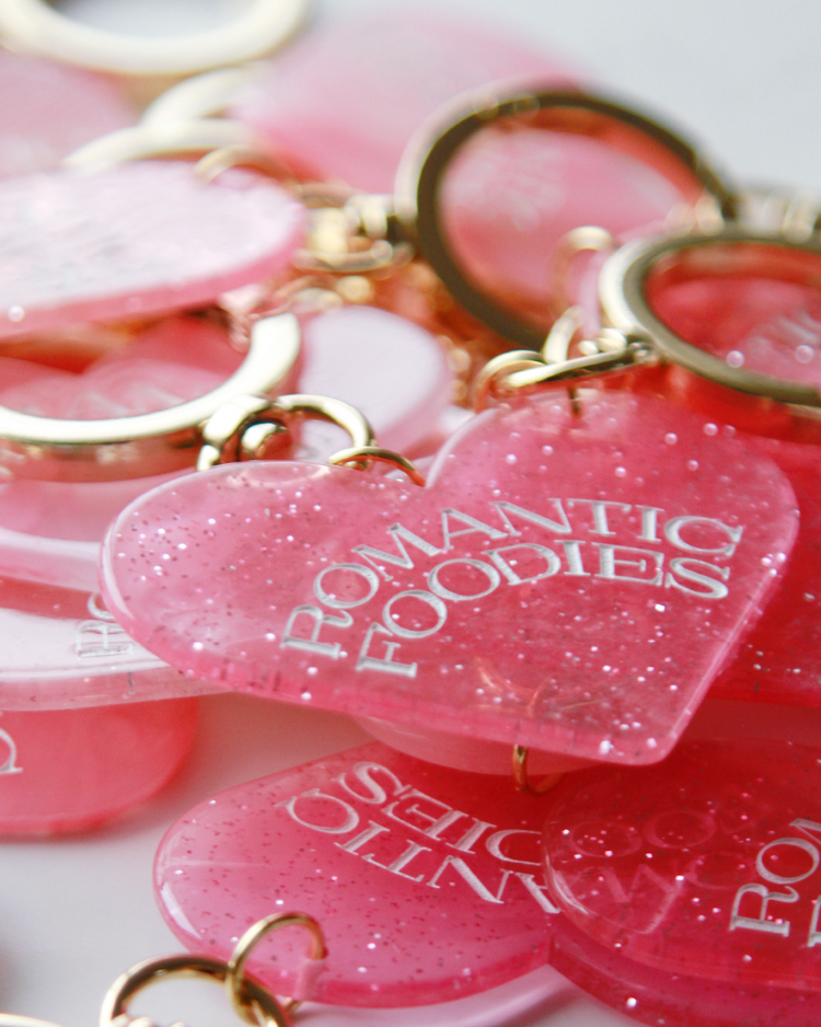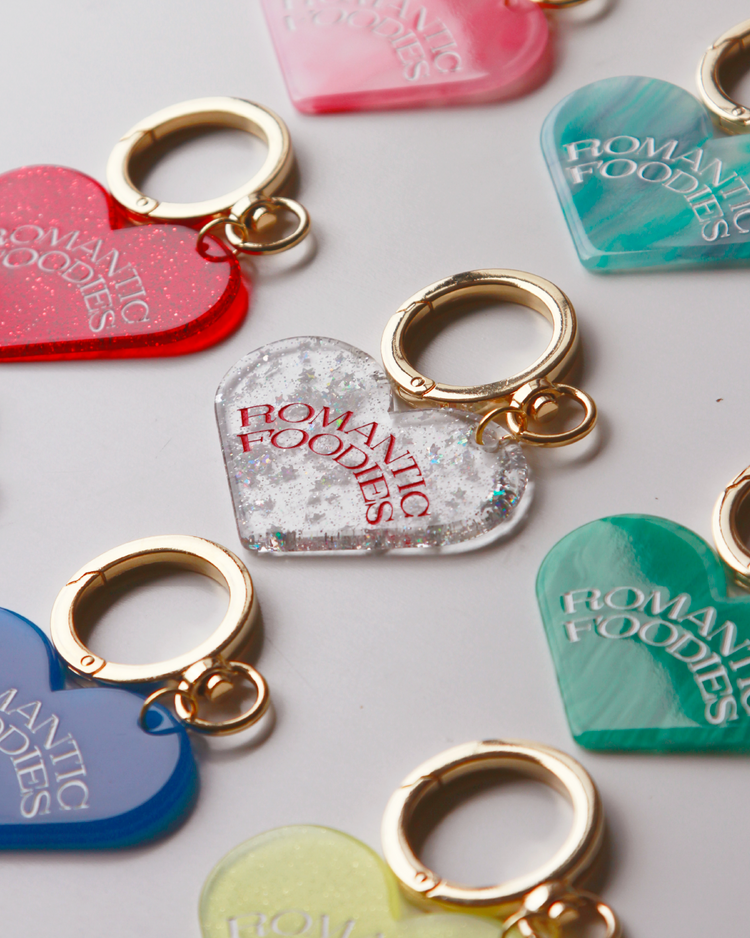 Romantic Foodiesでは資源の循環を行うリユースデザインアイテムを提案します。ハートのチャームは、国内の老舗アクリル工場で、製造過程で廃材になってしまうアクリル板の切れ端を再利用したオリジナルデザイン。