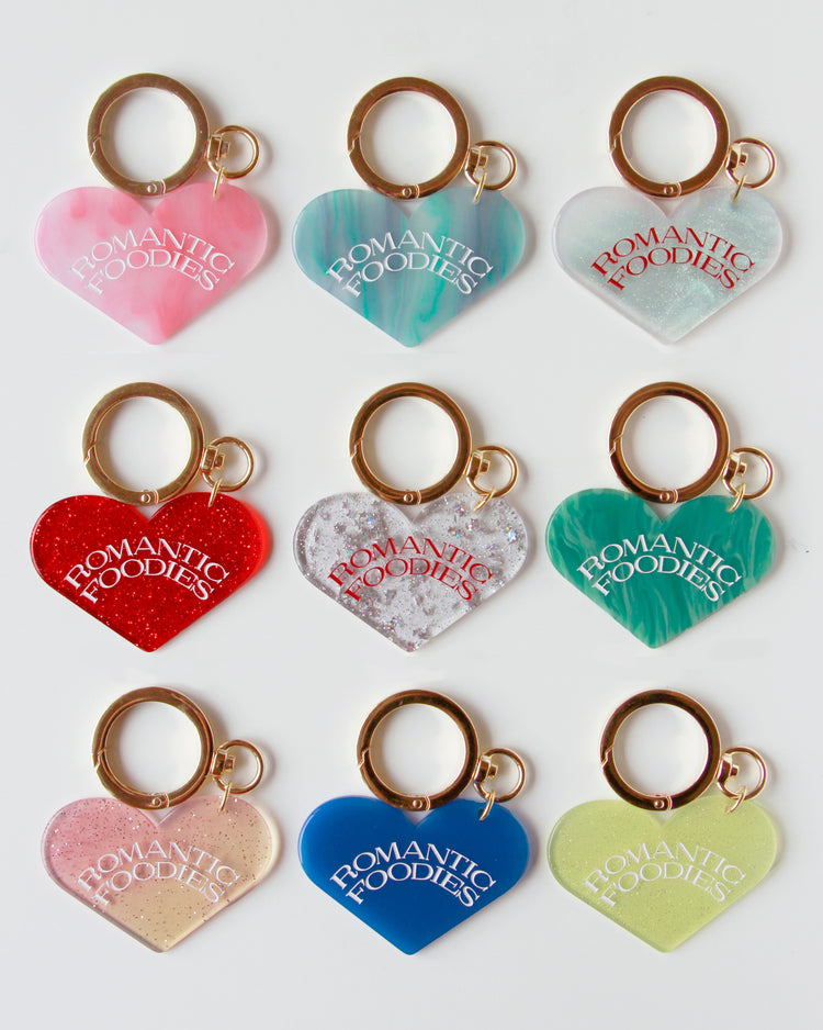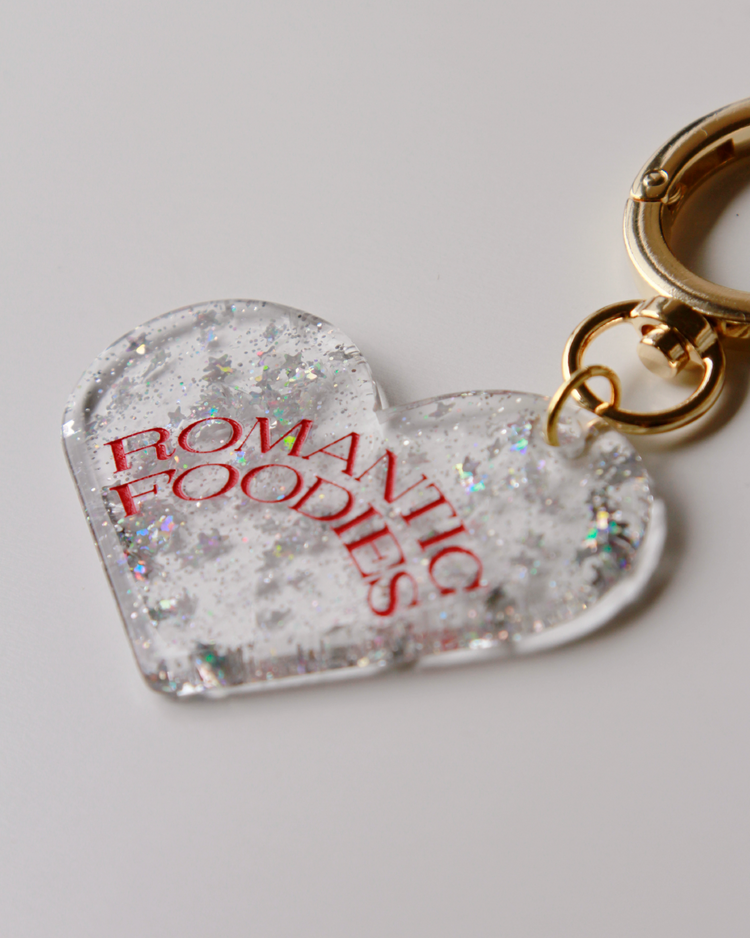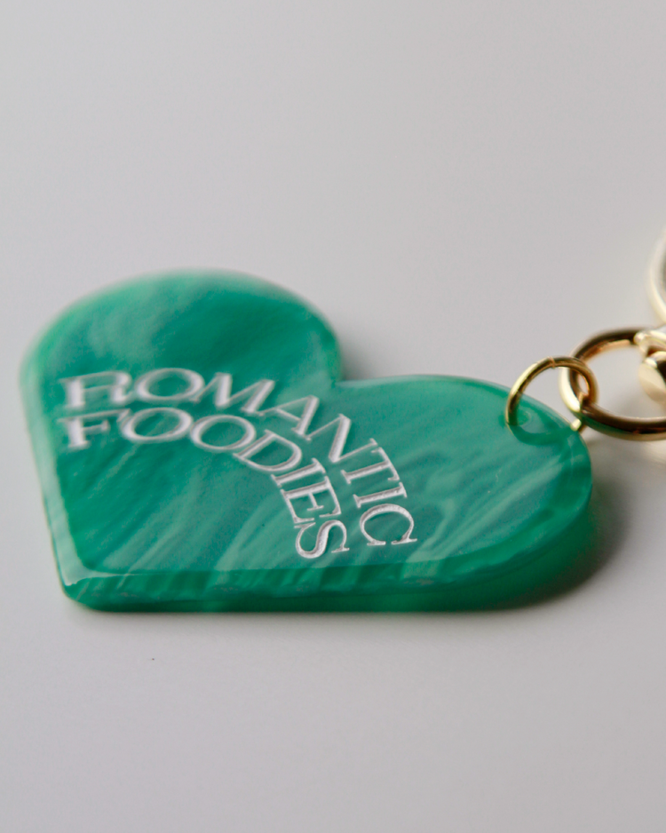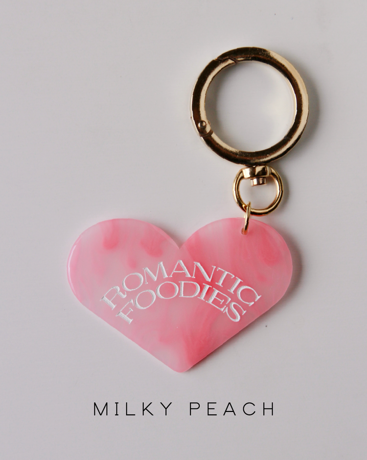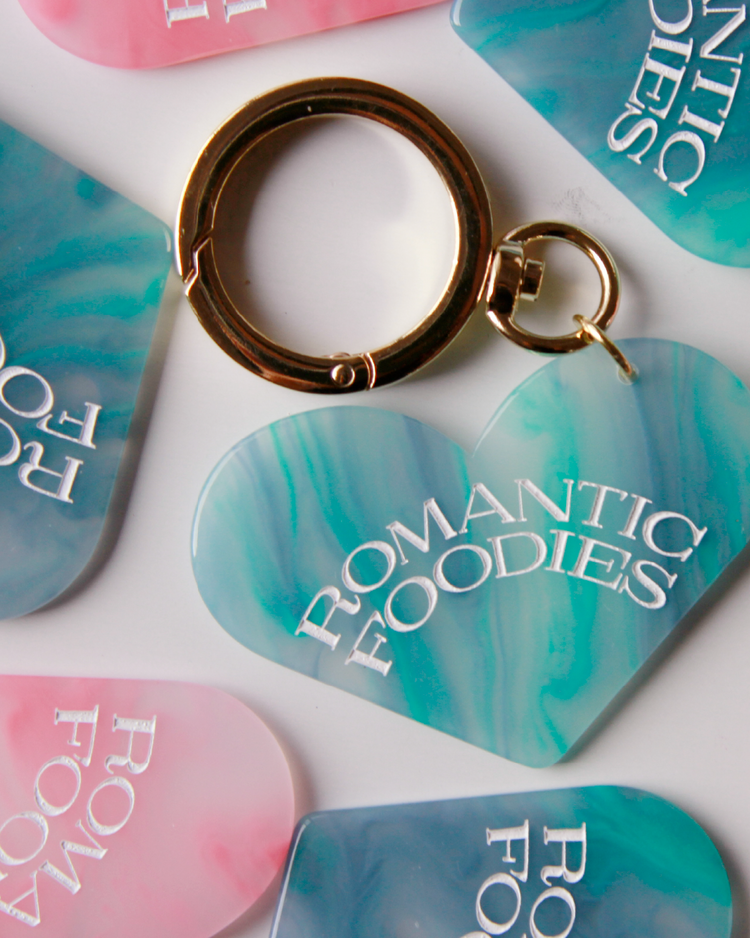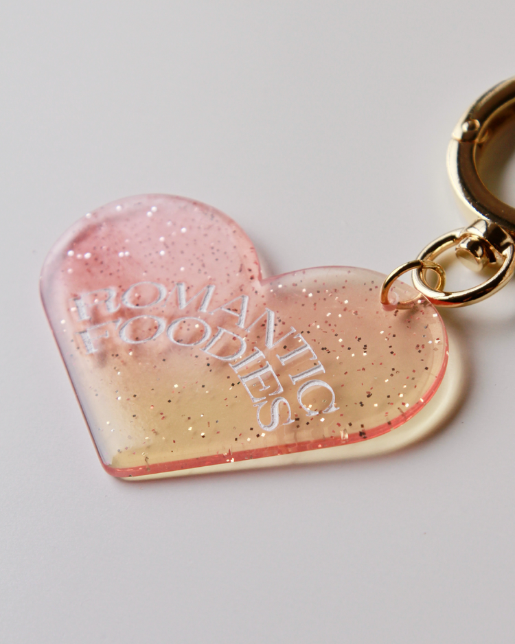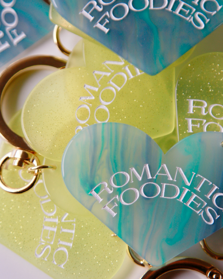 Romantic Foodiesでは資源の循環を行うリユースデザインアイテムを提案します。ハートのチャームは、国内の老舗アクリル工場で、製造過程で廃材になってしまうアクリル板の切れ端を再利用したオリジナルデザイン。