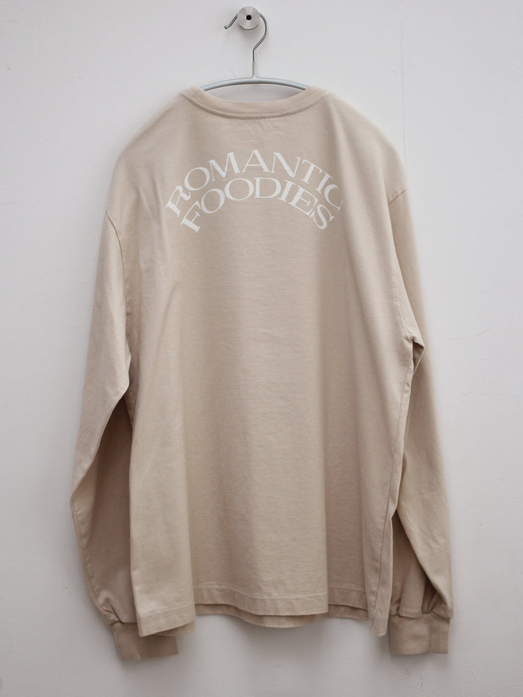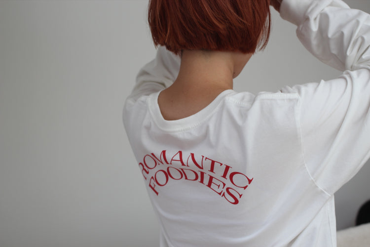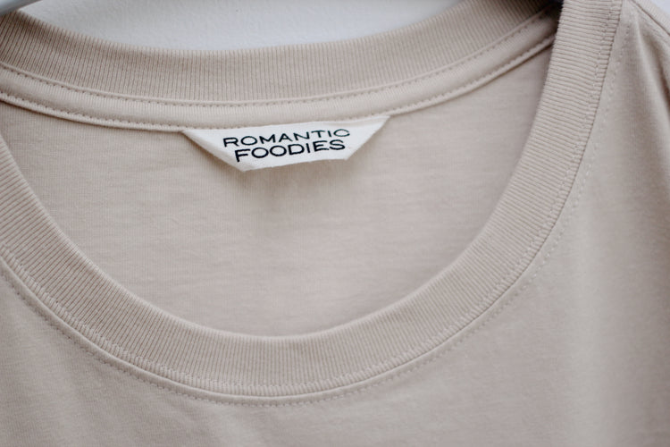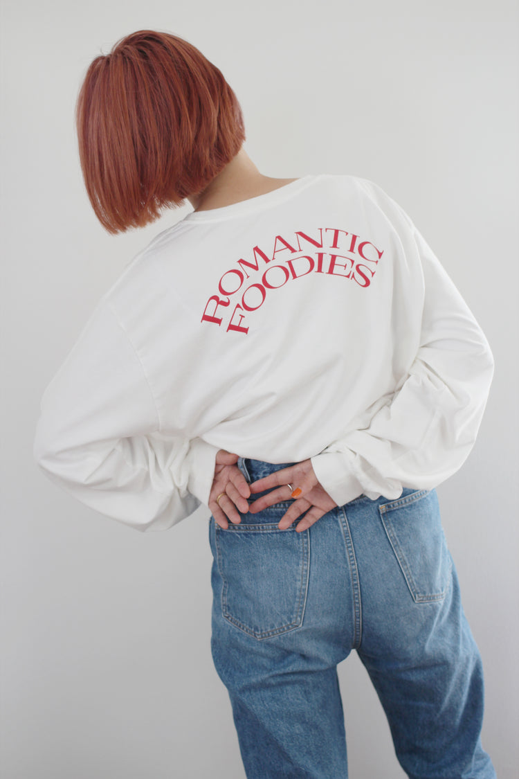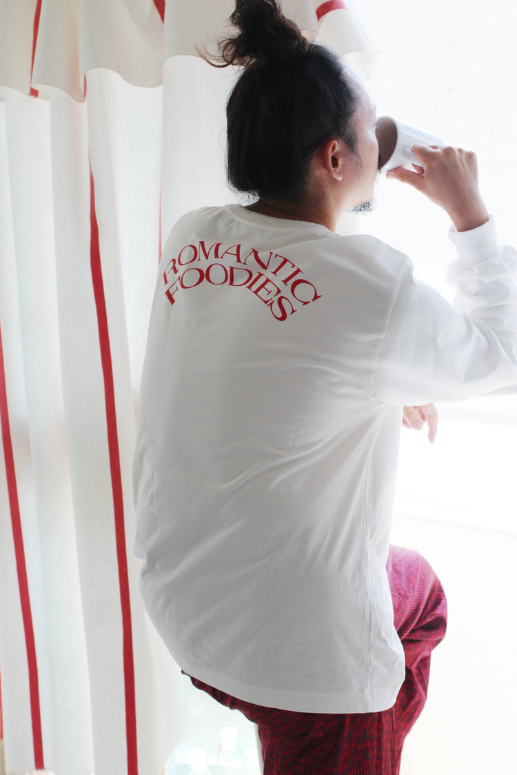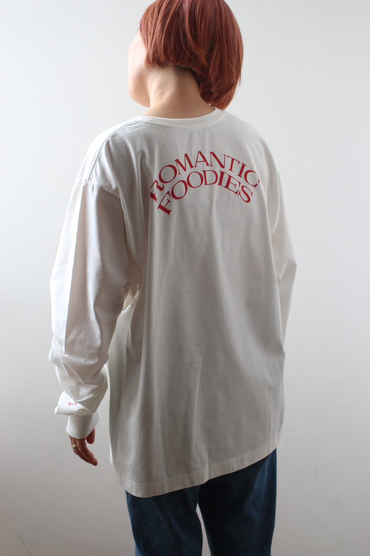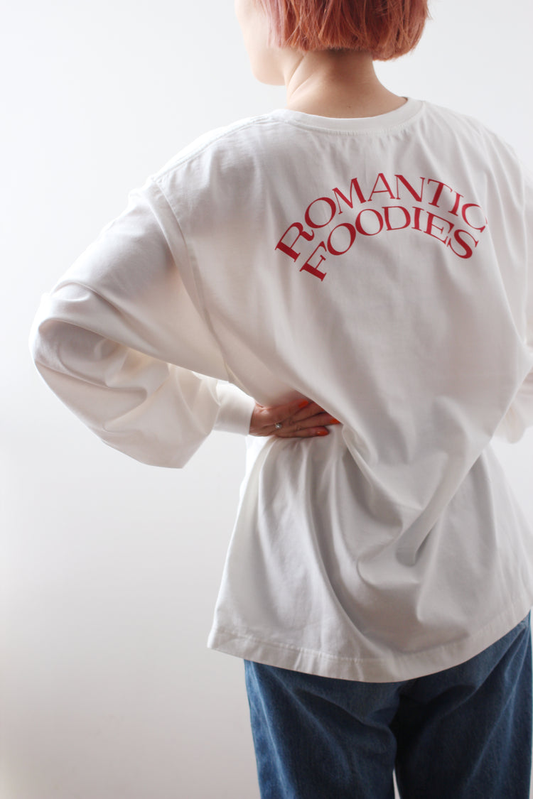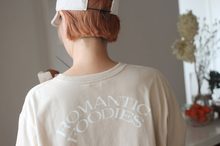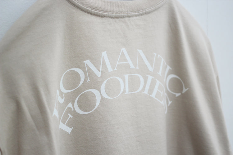 ゆったりとした心地よさと、フォルムにこだわった、Romantic Foodiesだけのオリジナルデザイン。首元はリラックス感のある適度な開きで、首の詰まったTシャツが苦手な方にもおすすめです。袖口のフライスをタイトに仕上げ、腕まくりもしやすく。