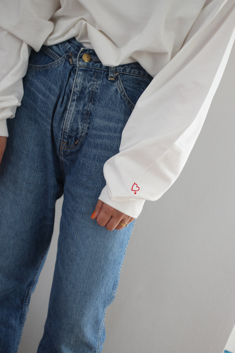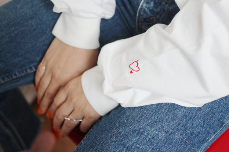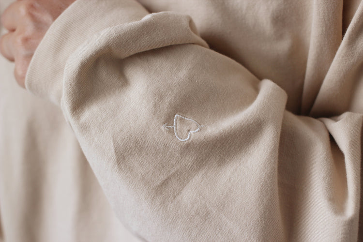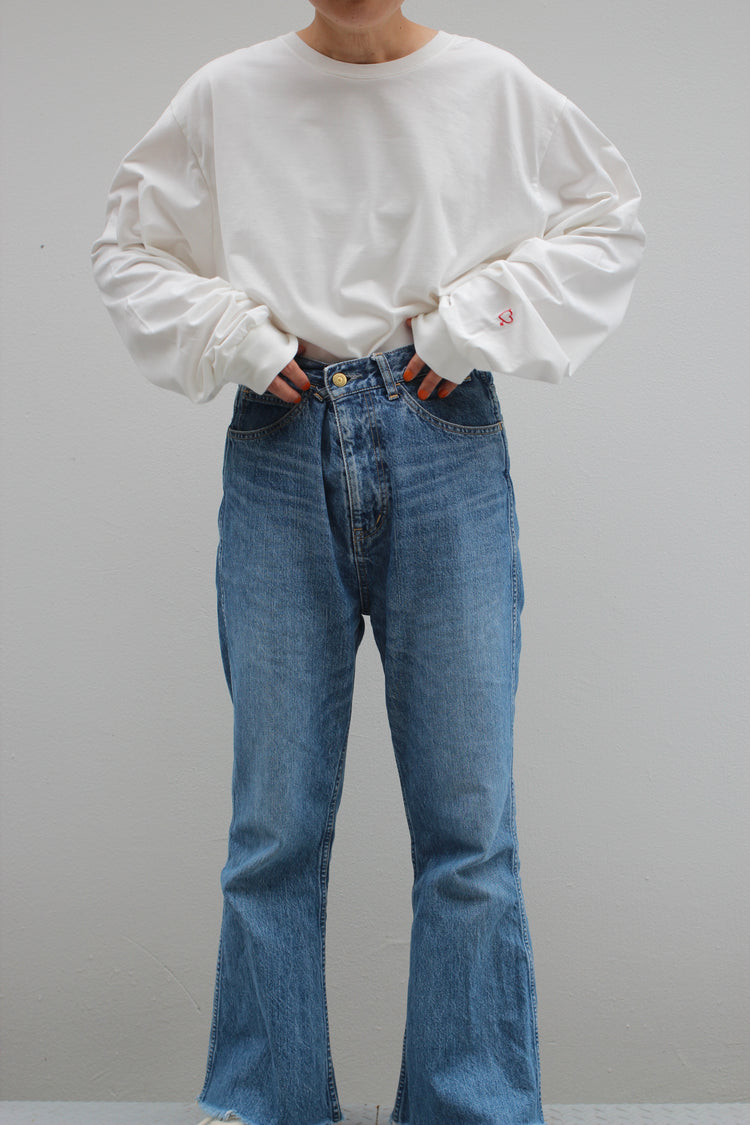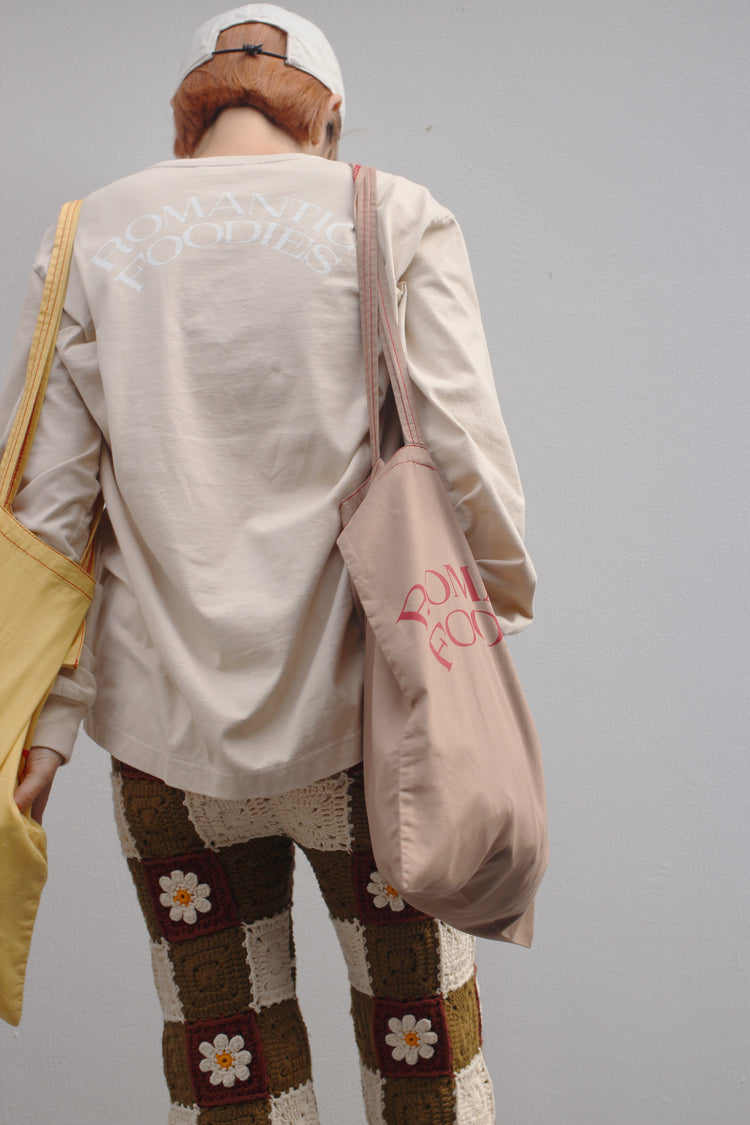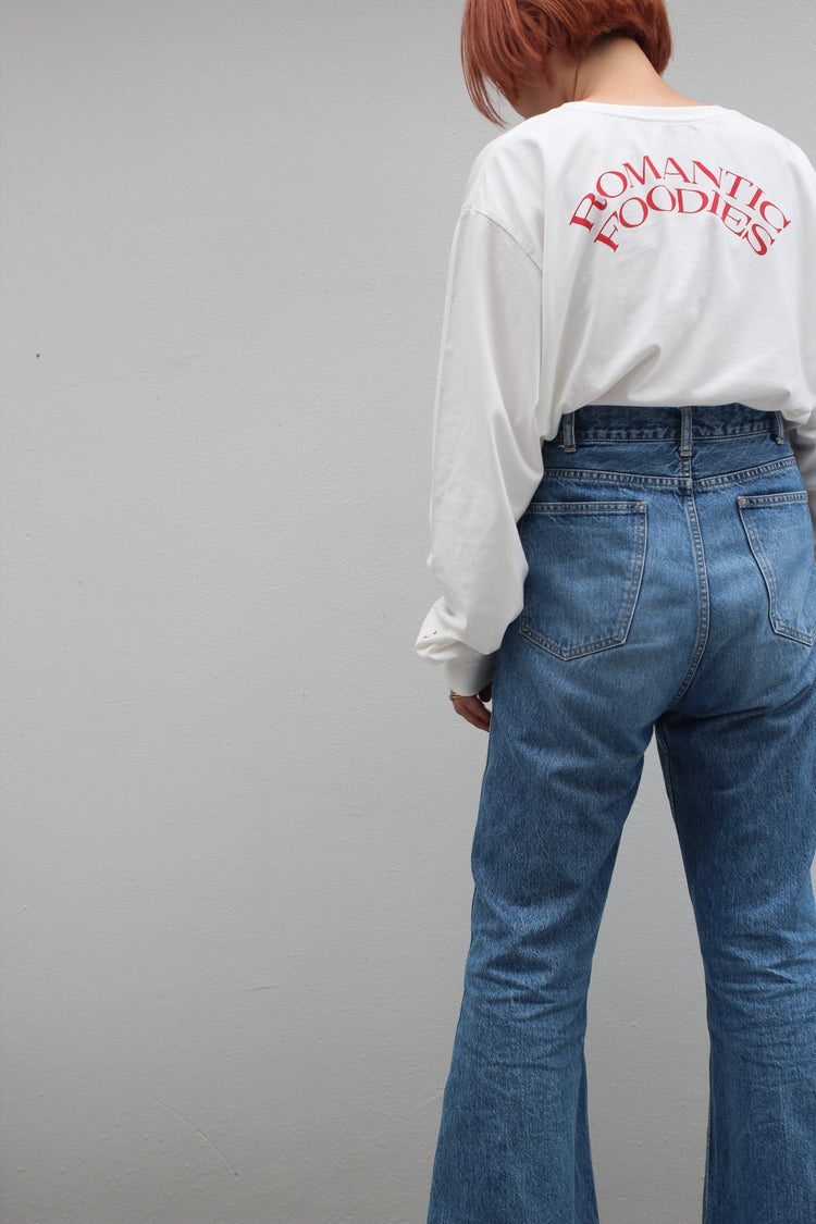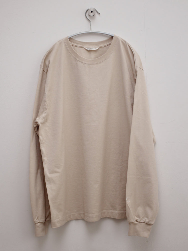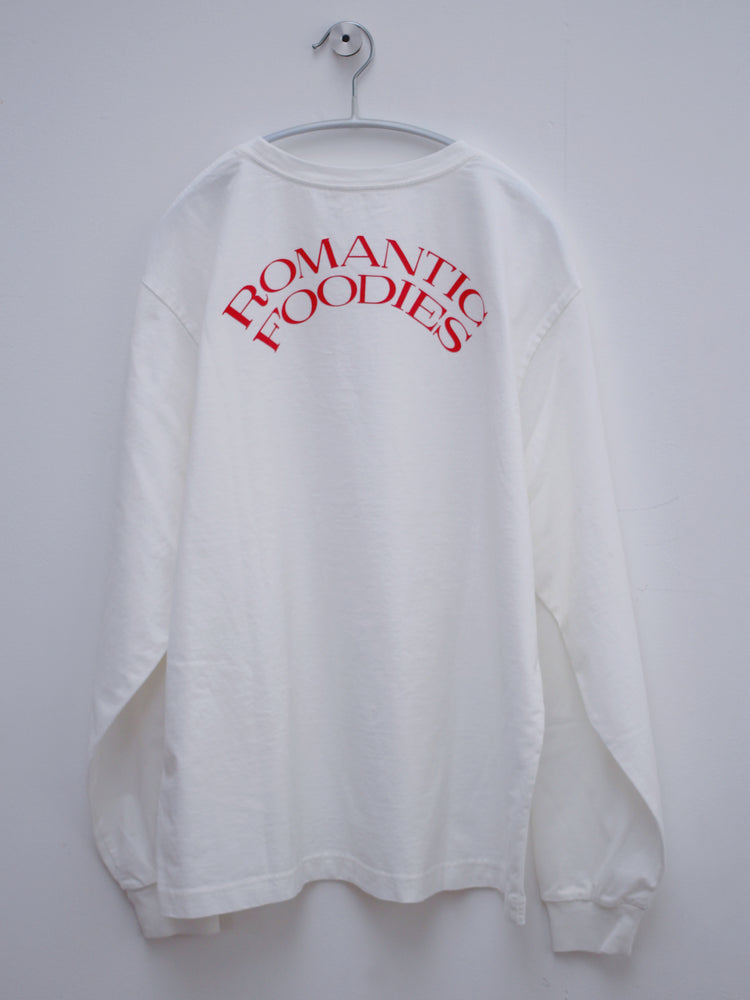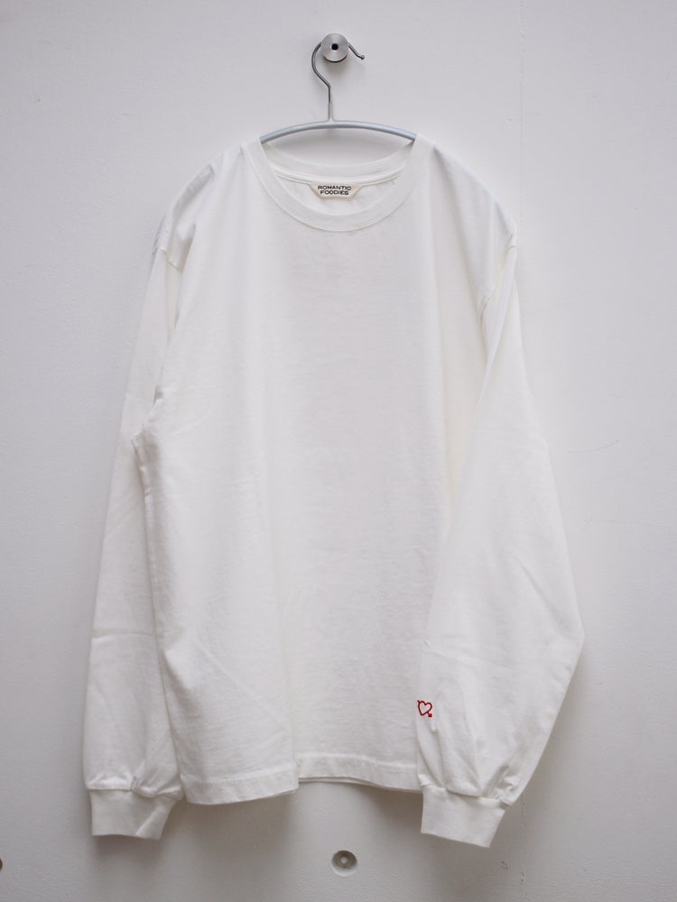 ゆったりとした心地よさと、フォルムにこだわった、Romantic Foodiesだけのオリジナルデザイン。首元はリラックス感のある適度な開きで、首の詰まったTシャツが苦手な方にもおすすめです。袖口のフライスをタイトに仕上げ、腕まくりもしやすく。