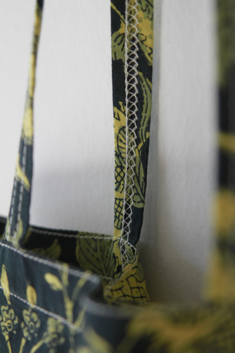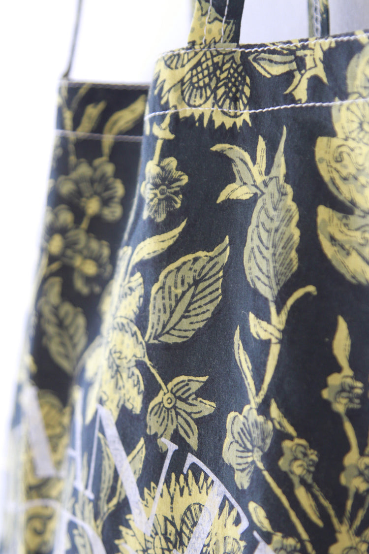 インドにて厳選セレクトした生地は、岡山県の工場にて縫製しています。ロゴは、シルクスクリーンによるハンドプリント。ステッチがポイントの持ち手は、ジーンズのベルトループを縫う専用ミシンで、ひとつひとつ丁寧に縫製しています。さらに、ウォッシュ加工で、ナチュラルな風合いに仕上がります。