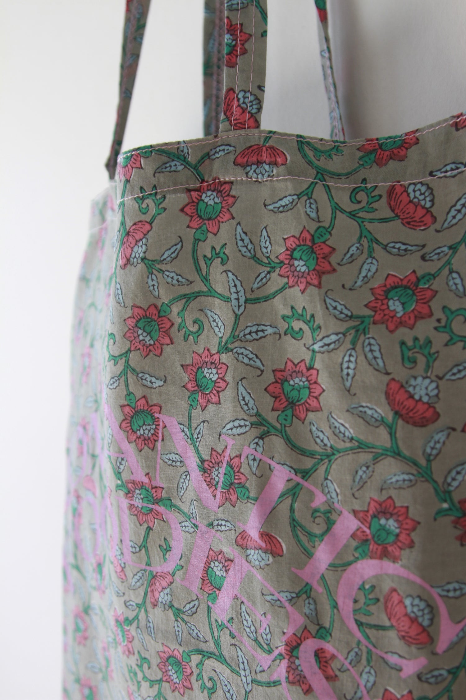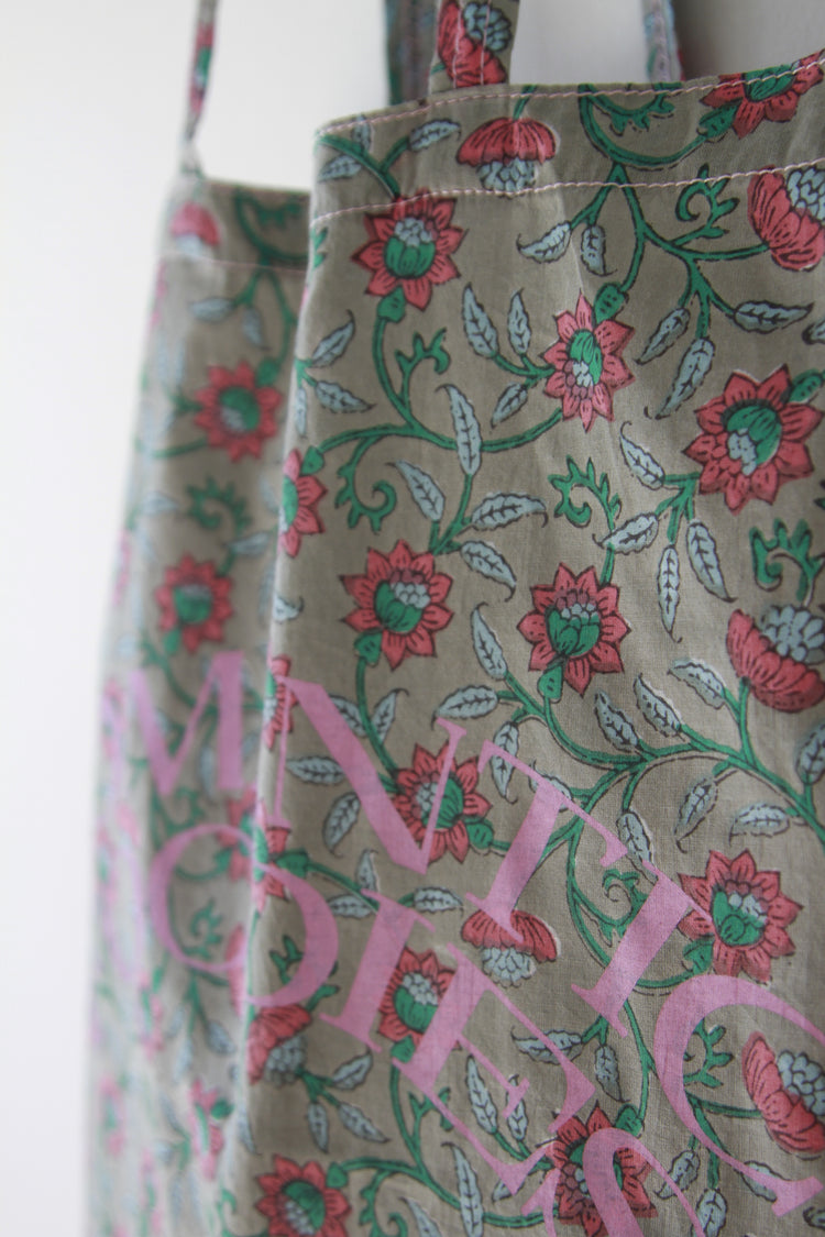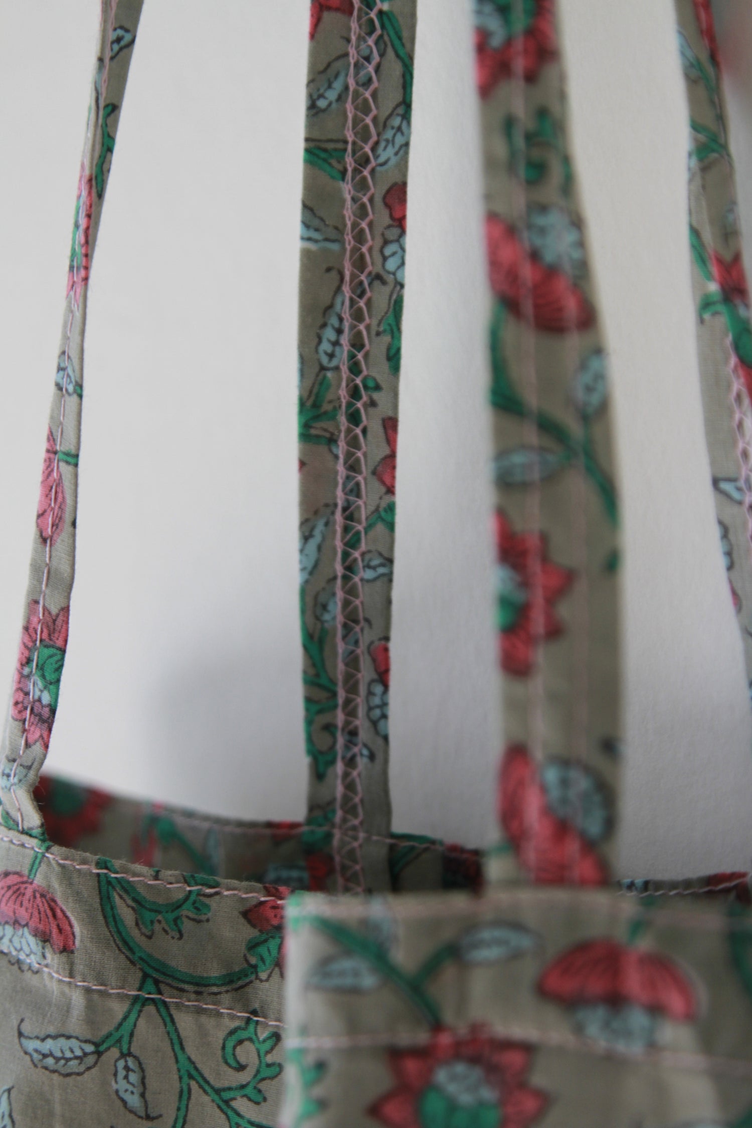 インドにて厳選セレクトした生地は、岡山県の工場にて縫製しています。ロゴは、シルクスクリーンによるハンドプリント。ステッチがポイントの持ち手は、ジーンズのベルトループを縫う専用ミシンで、ひとつひとつ丁寧に縫製しています。さらに、ウォッシュ加工で、ナチュラルな風合いに仕上がります。