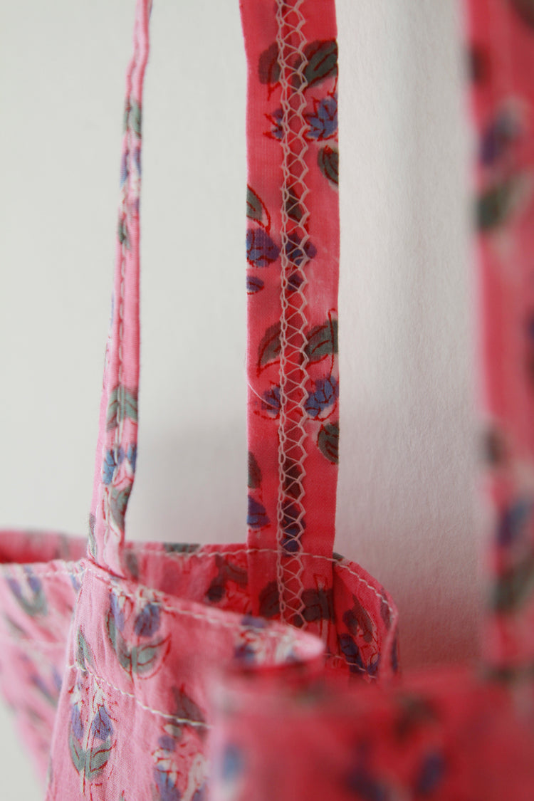 インドにて厳選セレクトした生地は、岡山県の工場にて縫製しています。ロゴは、シルクスクリーンによるハンドプリント。ステッチがポイントの持ち手は、ジーンズのベルトループを縫う専用ミシンで、ひとつひとつ丁寧に縫製しています。さらに、ウォッシュ加工で、ナチュラルな風合いに仕上がります。