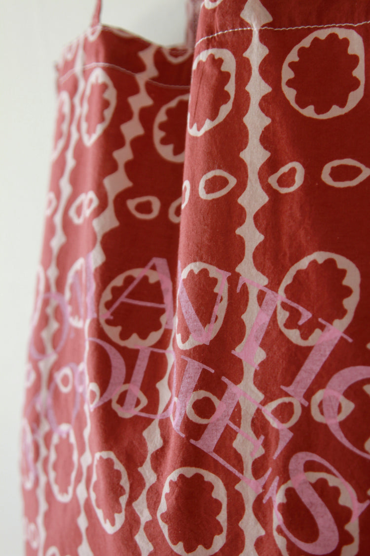インドにて厳選セレクトした生地は、岡山県の工場にて縫製しています。ロゴは、シルクスクリーンによるハンドプリント。ステッチがポイントの持ち手は、ジーンズのベルトループを縫う専用ミシンで、ひとつひとつ丁寧に縫製しています。さらに、ウォッシュ加工で、ナチュラルな風合いに仕上がります。