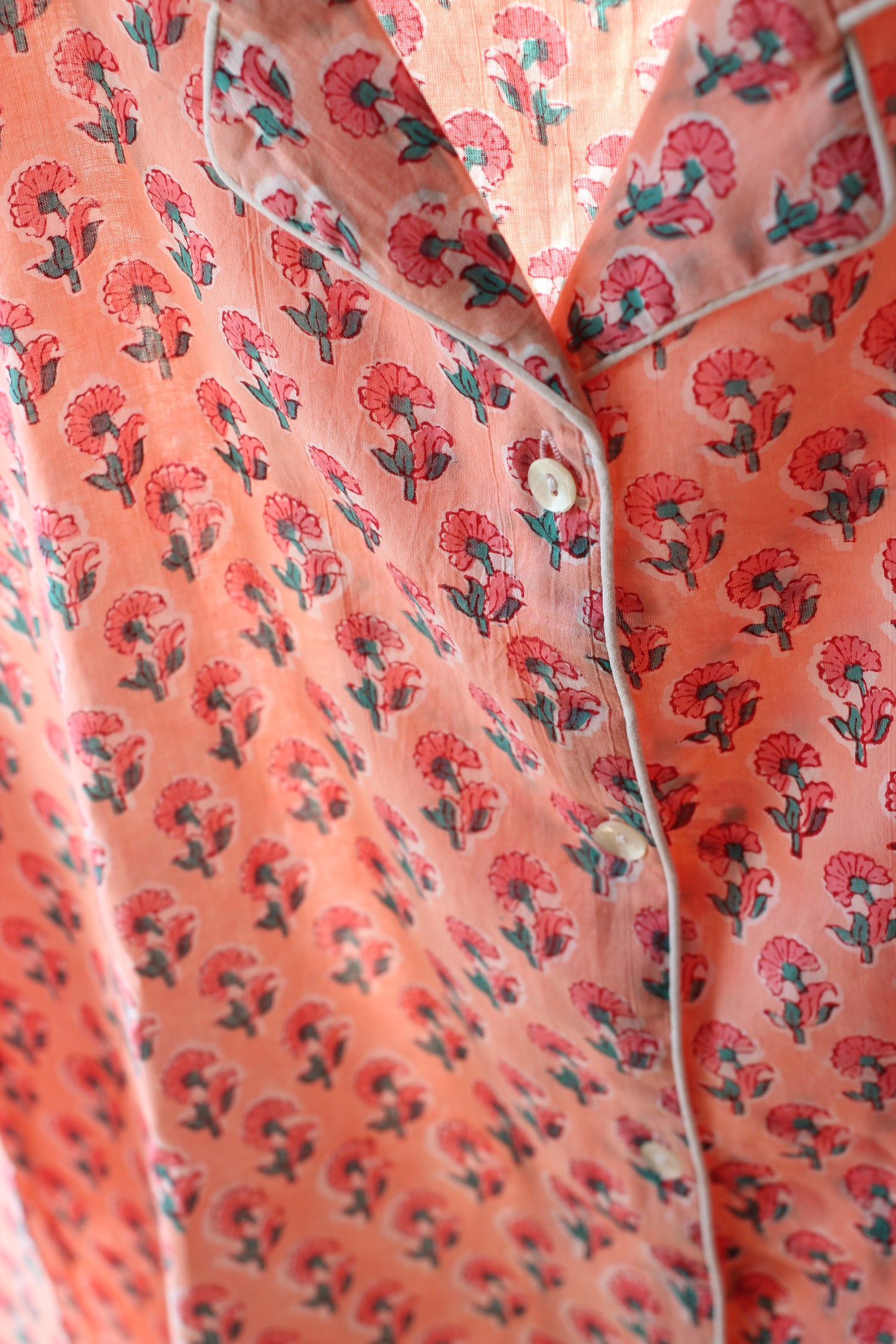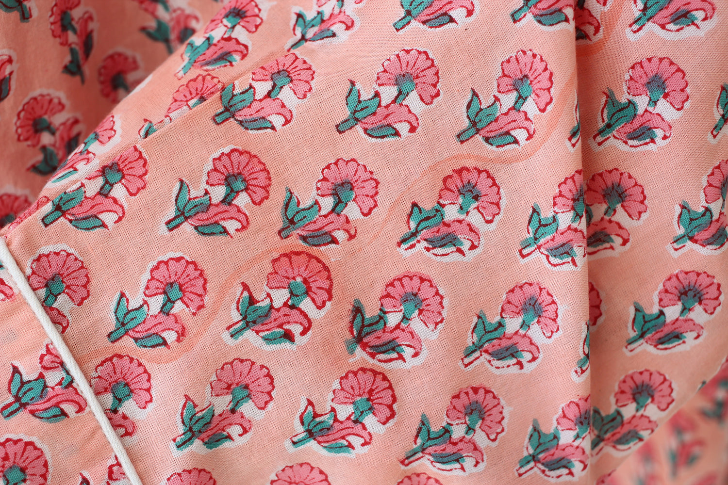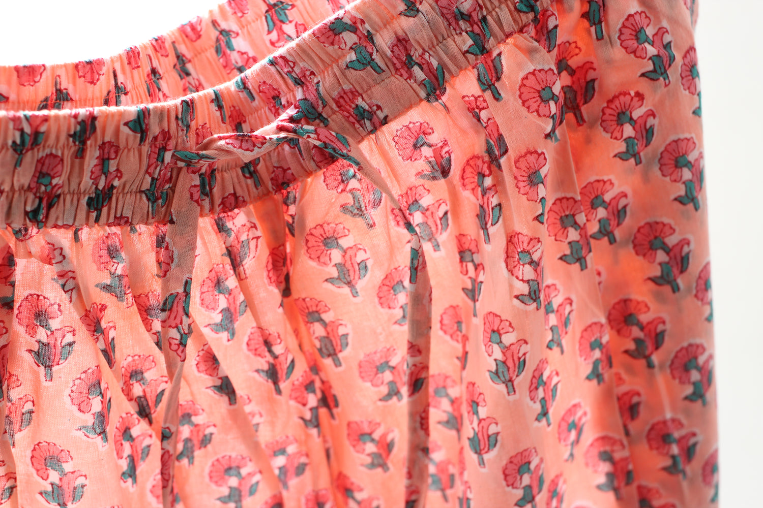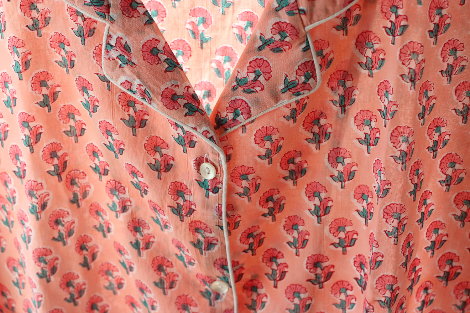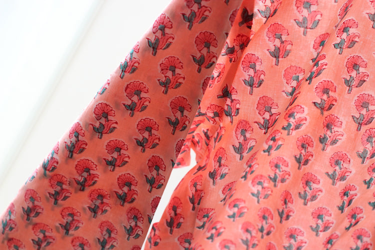 軽やかなコットンに丁寧に1色ずつ、重ねられる美しい柄。これは、インドの「ブロックプリント」という伝統工芸技術による製造方法です。