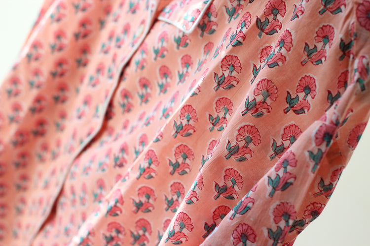 軽やかなコットンに丁寧に1色ずつ、重ねられる美しい柄。これは、インドの「ブロックプリント」という伝統工芸技術による製造方法です。